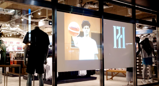 ON/OFFによる透明⇔不透明の切り替えに加えて、不透明状態ではプロジェクターで映像を投影し、デジタルサイネージとしても活用されているのが特徴です。